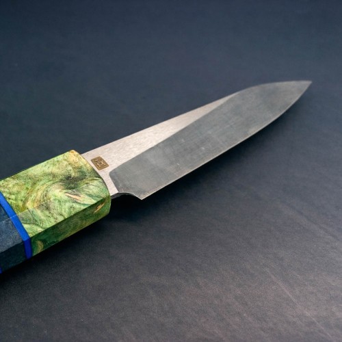 Petty bıçak, Japon mutfak geleneğinde hassas kesim ve detaylı hazırlık işlemleri için tasarlanmış kompakt ve çok yönlü bir mutfak bıçağıdır. Özellikle sebze ve meyve doğrama, soyma ve ince kesim işlemlerinde ergonomik yapısı ve dengeli namlu formuyla üstün kontrol sağlar.Böhler N690 çelikten üretilen namlu, yüksek korozyon direnci, uzun süreli keskinlik ve güvenilir kesim performansı sunar. 2,5 mm kalınlık, hassas mutfak işlemleri için ideal dengeyi sağlar. Ambonya kombinasyon kabza ise egzotik ahşabın benzersiz damar yapısı ve estetik karakteriyle ergonomik, dengeli ve konforlu bir tutuş sunar.Geleneksel Japon mutfak çizgilerine bağlı kalınarak sanatsal dokunuşlarla üretilen bu el yapımı Petty bıçak, profesyonel mutfaklar ve günlük kullanım için vazgeçilmez bir yardımcıdır.