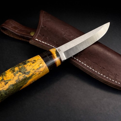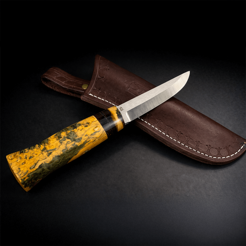 Puukko, İskandinav kültürünün yüzyıllardır kullanılan en işlevsel ve güvenilir bıçak formudur. Günlük kullanım ve doğa yaşamı için geliştirilen bu geleneksel tasarım, tecrübe ve zanaatkârlığın modern malzeme teknolojisiyle birleşmesiyle yeniden hayat bulmuştur.Üstün performanslı Böhler M398 çelikten üretilen namlu, yüksek aşınma direnci, uzun süreli keskinlik ve zorlu saha koşullarında maksimum güvenilirlik sunar. 3,4 mm kalınlığı sayesinde hem güçlü hem de kontrollü kesim performansı sağlar. Çift renk Korelian huş ağacı ve mamut kombinasyon kabza, doğal malzemelerin estetik karakterini ergonomik ve sağlam bir tutuş ile birleştirir.Kamp, bushcraft, doğa yürüyüşü ve tüm outdoor aktivitelerinde güvenle kullanılabilecek bu el yapımı Puukko bıçak, geleneksel İskandinav ruhunu modern performans standartlarıyla buluşturan seçkin bir parçadır.