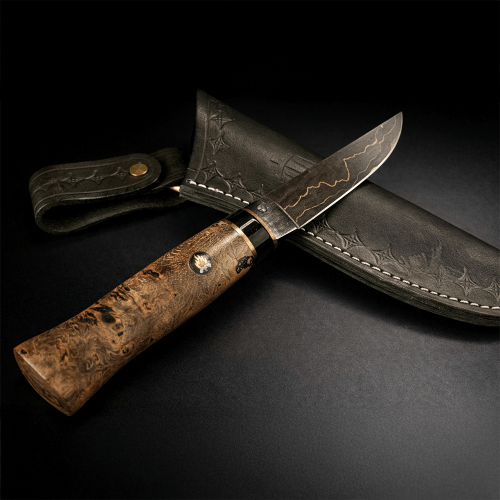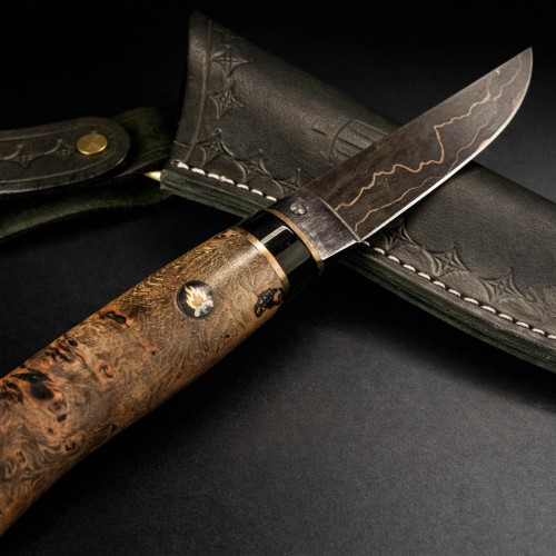 İskandinav geleneğinin en köklü ve işlevsel bıçak formu olan Puukko, yüzyıllardır günlük kullanım ve doğa yaşamının vazgeçilmez bir parçası olarak kullanılmaktadır. Bu özel üretim model, geleneksel formun tecrübe ve sanatla birleşerek modern bir yorumu olarak yeniden hayat bulmuştur.Bakır Sanmai çelik yapısı, sert çekirdek çeliği koruyan dış katmanları sayesinde hem üstün keskinlik hem de yüksek dayanıklılık sunar. 2,9 mm kalınlığa sahip namlu, hassas kesim kabiliyeti ve kontrollü kullanım için ideal denge sağlar. Egzotik ahşap ve manda boynuzu kombinasyon kabza ise doğal malzemelerin estetik uyumunu ergonomik tutuş ile birleştirir.Kamp, bushcraft, doğa yürüyüşü ve tüm outdoor aktivitelerinde güvenilir bir yardımcı olan bu el yapımı Puukko bıçak, geleneksel İskandinav zanaatkârlığını modern üretim kalitesiyle buluşturan özel bir parçadır.